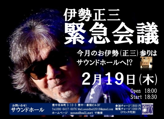 2月19日(木)は恒例『伊勢正三緊急会議』 Open18:00 start18:30参加charge1800yen 観覧charge100...