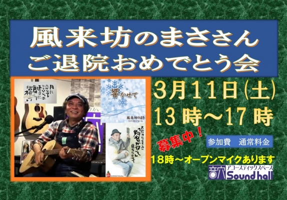 まささんへ退院のお祝いとアーティスト活動再開エールを歌って,まささんのこころに「響かせて♪」頂ければと思います。急きょの開催のため、ご都合の良い方のみになるかと思いますが、ご交流の多いまささんのことですから、また他店でも同様のイベントもあるかと思います。皆様のご参加をお待ちしております m(..)m