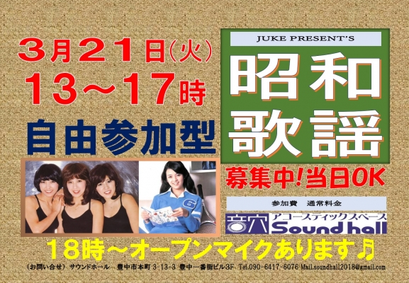 3月21日(火・春分の日)13~17時 昭和歌謡(JUKE PRESENT'S) 開催します♫あなたの心に残る昭和歌謡をお聞かせください。自由参加で入場順にご披露ください(参加費は通常料金です)皆様の...