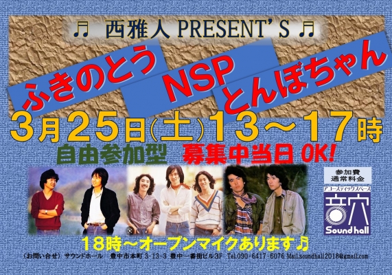 3月25日(土)13~17時 ふきのとう・NSP・とんぼちゃん しばり(西雅人 PRESENTS) 開催します♫ 当店、初開催になります♬自由参加で入場順にご披露ください(参加費は通常料金です)♫皆様...