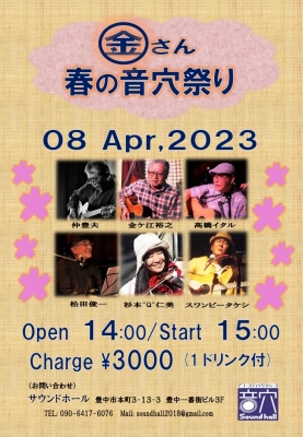 4月8日(土) 『㊎さん春の音穴祭り』 開場14時/開演15時 入場料3000円(1ドリンク付)超絶技巧ギタリスト㊎さんこと金ヶ江裕之さんがミュージシャン達とのブルージーでゴキゲンなLIVEを開催♪バ...