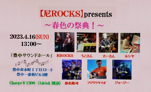 4月16日(日)13時~【尼ROCKS】presents~春色の祭典!~なんだか楽しいメンバーの賑やかなステージが繰り広げられる一日になりそうです♬是非、ご観覧ください!18時からオープンマイクありま...