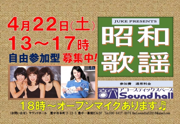 4月22日(土)13~17時 昭和歌謡(JUKE PRESENT'S) 開催します♫今や人気イベントになりました「昭和歌謡しばり」!あなたの心に残る昭和歌謡をお聞かせください。自由参加で入場順にご披露...
