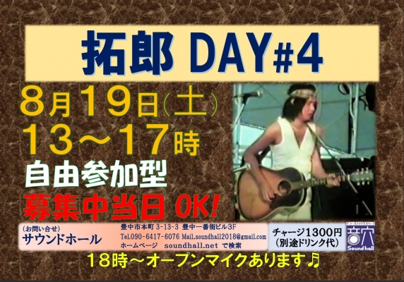 吉田拓郎しばり『拓郎DAY#4』8月19日(土)13~17時 開催します!自由参加、当日OK!ご都合よろしければ、是非ご参加お待ちしております♫ チャージ1300円(別途ドリンク代)18時からはオー...