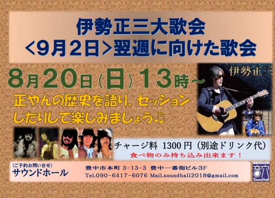 8月20日(日)13時~ 『伊勢正三大歌会(翌週)に向けた歌会』開催♫正やんしばりです(^^♪みんなで正やんを歌ってください♬そして9月2日「大歌会」を迎えましょう!!多数の皆さんのご来店をお待ちして...