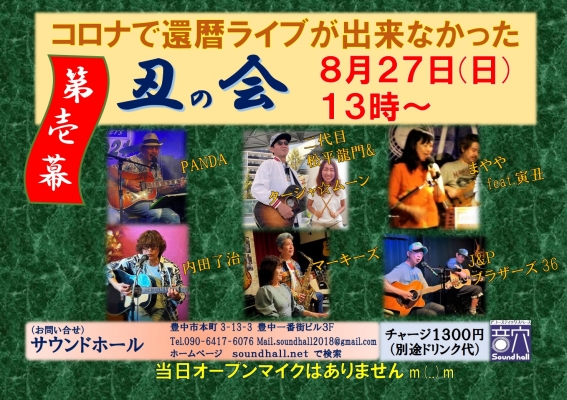 コロナで還暦ライブが出来なかった丑年生まれ(同学年)の方々と、8月27日(日)13時~『丑の会 第壱幕』ブッキング形式の歌会を開催します♬(順不同・敬称略) PANDA 二代目松平龍門&ターシ...