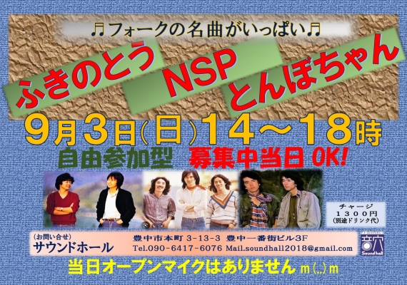 9月3日(日)14~18時 ふきのとう・NSP・とんぼちゃん しばり開催します♫自由参加で入場順にご披露ください(参加費は通常料金です)♫皆様のご来店をお待ちしております♫...