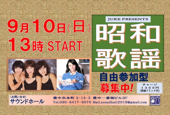 9月10(日)13~ 昭和歌謡(JUKE PRESENT'S) 開催します♫今や人気イベントになりました「昭和歌謡しばり」!あなたの心に残る昭和歌謡をお聞かせください。自由参加で入場順にご披露ください...