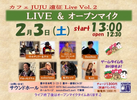 2月3日(土) start 13:00『カフェ JUJU遠征 Live vol.2』 ~Live&オープンマイク~ <出演者>① リトルチェリー&テル ② すわっちゴラム③ ストーリーミュージシャンし...