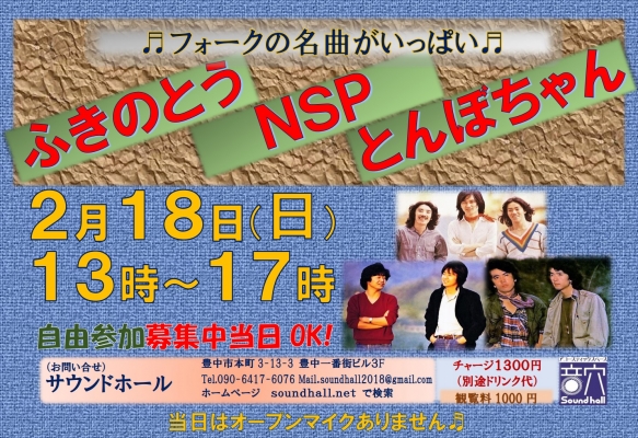 2月18日(日)13時~17時『ふきのとう・NSP・とんぼちゃん』開催♫昭和フォークの名曲が多いこの3組♬自由参加で入場順にご披露ください!参加費:チャージ1300(ドリンク別途)観覧料1000円(ド...