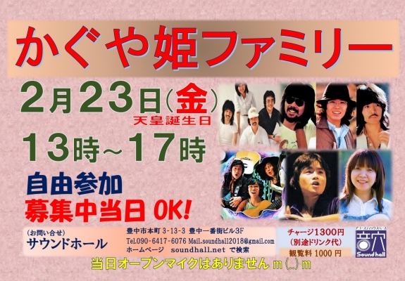 2月23日(金・祝日)13時~17時『かぐや姫ファミリー』を開催します♪かぐや姫メンバー関連のアーティストならOK!皆様のご参加をお待ちしております♬参加費:チャージ1300円(ドリンク別途) 観覧...
