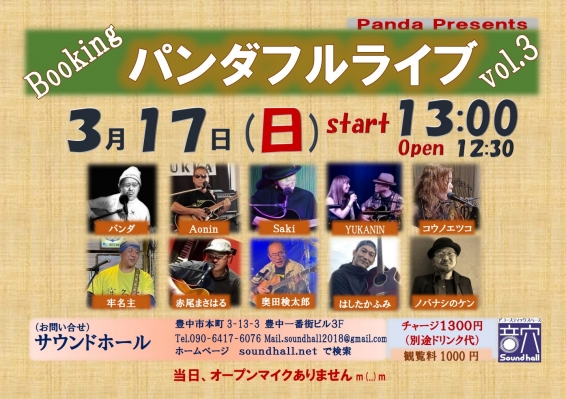 3月17日(日)13時~PANDA Presents『パンダフルライブvol.3』Booking LIVEを開催します♬<出演> (1) パンダ (2) Aonin (3) Saki (4)...