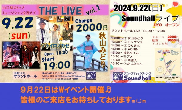 9月22日(日)は2イベントです♬【昼の部】『ブッキングライブseptember♪』<出演>① 秋山みどり ②モッケンズ ③のんきち ④AONIN ⑤アメ ⑥西雅人 ⑦かじた (敬称略、順番あみだくじ...