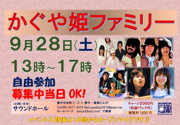 9月28日(土)13時~17時『かぐや姫ファミリー』を開催します♪かぐや姫メンバー関連のアーティストならOK!参加費:チャージ2000円(ドリンク別途)観覧のみ:チャージ1000円(ドリンク別途)イベ...