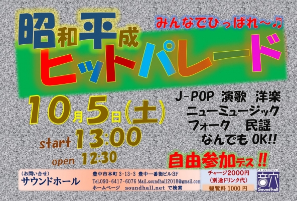 10月5日(土)”新企画”『昭平ヒットパレード』開催♬昭和歌謡だけじゃない!平成もエエ曲があるっ!との声にお応えして昭和・平成しばり!題して「昭平ヒットパレード」開催します。J-Pop、演歌、フォーク...