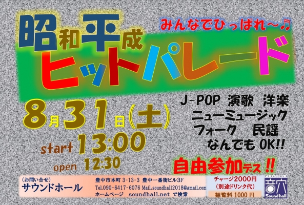8月31日(土)”新企画”『昭平ヒットパレード』開催♬昭和歌謡だけじゃない!平成もエエ曲があるっ!との声にお応えして昭和・平成しばり!題して「昭平ヒットパレード」開催します。J-Pop、演歌、フォーク...