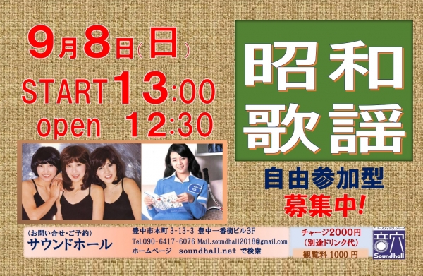 9月8日(日)13時~は『 昭和歌謡しばり』 開催します♫「昭和歌謡しばり」!あなたの心に残る昭和歌謡をお聞かせください。自由参加で入場順にご披露ください♪参加チャージ2000円(別途ドリンク代)、...