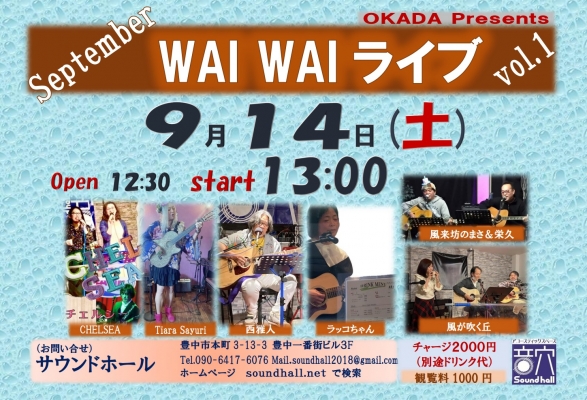 9月14日(土) 『WAI WAI ライブ vol.1』OKADA Presents 開催♬<出演>CHELSEA Tiara Sayuri 西雅人 ラッコちゃん 風来坊のまさ&栄久 風が吹く丘 ...