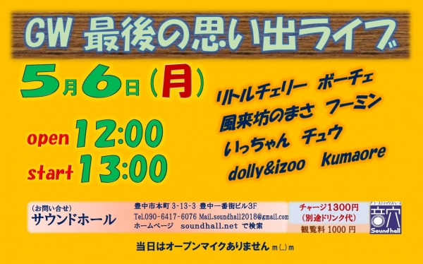 5月6日(月)13時~『GW最後の思い出ライブ』開催します♬ スタート 13:00リトルチェリー ボーチェ 風来坊のまさ フーミン いっちゃん チュウ dolly&izoo kumaore (順不同...