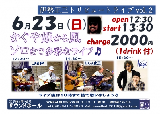 6月23日(日) 伊勢正三トリビュート・ライブvol.2 開催♬かぐや姫から風、そしてソロ時代へと正やんの遍歴を3組のユニットが辿ります(^^♪お得でおススメなライブですよ(^^)vopen12:30...