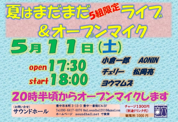 5月11日(土)『夏はまだまだ5組限定ライブ&オープンマイク』開催します♬open 17:30 start 18:00AONIN 小倉一郎 チェリー 松岡亮 ヨウマムズ (順不同、敬称略)観覧チャージ...