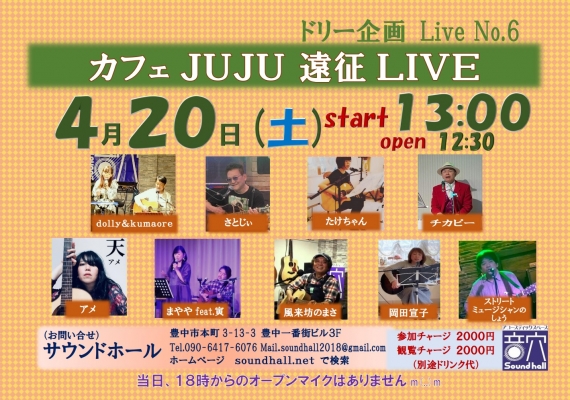 4月20日(土) start 13:00『カフェ JUJU遠征 Live vol.6』 <出演者>① dolly&kumaore ② さとじぃ ③ ストーリートミュージシャンのしょう ④ たけちゃん...