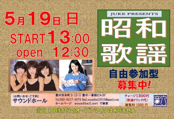 5月19(日)13時~ 昭和歌謡(JUKE PRESENT'S) 開催します♫「昭和歌謡しばり」!あなたの心に残る昭和歌謡をお聞かせください。自由参加で入場順にご披露ください♪ 参加チャージ1300...
