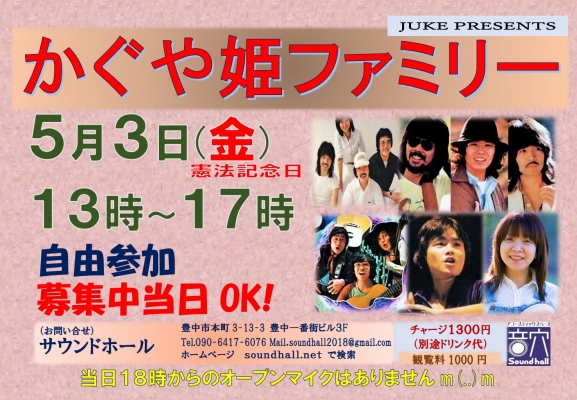 5月3日(金・祝日)13時~17時『かぐや姫ファミリー』(JUKE Presents)を開催します♪かぐや姫メンバー関連のアーティストならOK!皆様のご参加をお待ちしております♬参加費:チャージ130...