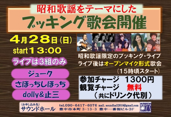 初企画!4月28日(日)13時~昭和歌謡テーマでブッキング&オープンマイク♬3組だけのブッキングライブでその後はオープンマイク形式でゆっくりとご披露ください!!<ブッキング出演>ジューク さほっちしほ...