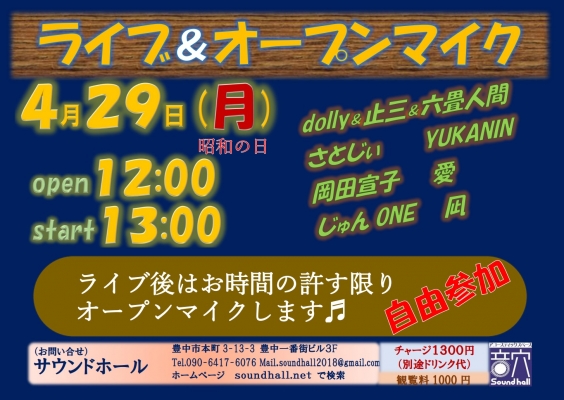 4月29日(月・昭和の日)BookingLIVE&OpenMIC』開催します♬ スタート 13:00Dolly&止三&六畳人間 さとじぃ 岡田宣子 愛 じゅんONE YUKANIN 凪 (順不同、敬称...