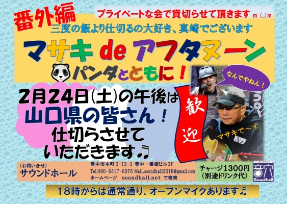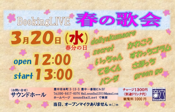 3月20日(水・春分の日)BookingLIVE『春の歌会』開催します♬ スタート 13:00green go てるくん すわっちゴラム いっちゃん かわこう さほっち パンダ dolly&ku...