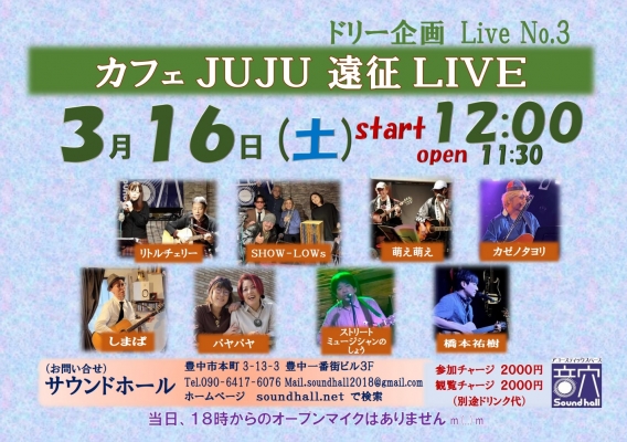 3月16日『カフェ☕️JUJU遠征 LIVE』ドリー企画ライブvol.3 IN サウンドホール 開催します♬ スタート 12:00リトルチェリー しまぱ 萌え萌え 橋本祐樹 ストリートミュージシャン...