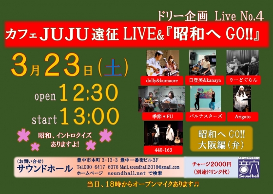 3月23日『カフェ☕️JUJU遠征 LIVE&昭和へGO!』ドリー企画ライブvol.4 IN サウンドホール 開催します♬ スタート 13:00dolly&kumaore 日登美&kanaya り...