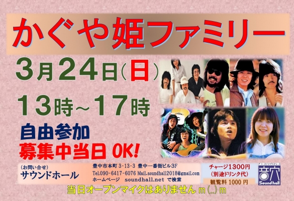 3月24日(日)13時~17時『かぐや姫ファミリー』を開催します♪かぐや姫メンバー関連のアーティストならOK!皆様のご参加をお待ちしております♬参加費:チャージ1300円(ドリンク別途) 観覧のみ:...