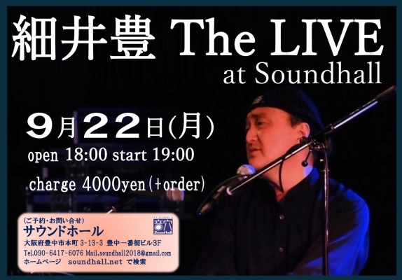 9月22日(月)『細井豊 THE LIVE』開催♬ open 18:00 start 19:00 入場料 4000yen(+order)ご予約・お問合せはサウンドホールま...