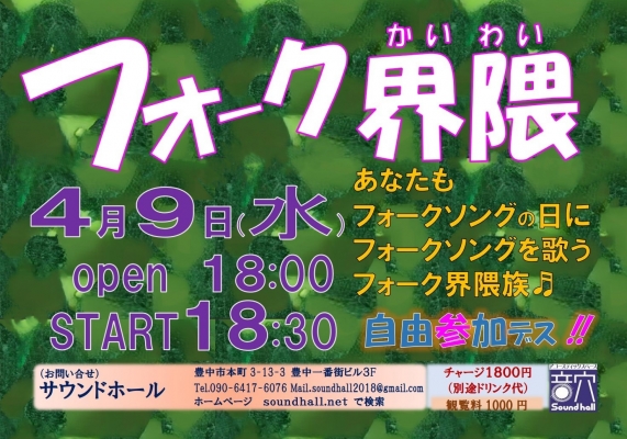 来週4月9日(水)“フォークの日” 特別な日なんで『フォーク界隈』と題して臨時オープンマイク営業させて頂きます♬あなたもフォークの日にフォークを歌ってフォーク界隈族に😊 この日にオープンマイクのお店を...