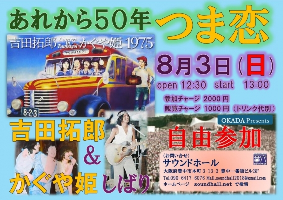 8月3日(日)13時~『あれから50年~つま恋~』1975年8月2・3日に吉田拓郎&かぐや姫によって、つま恋で開催された伝説のコンサートからちょうど50年を記念して、つま恋に出演したアーティストしばり...
