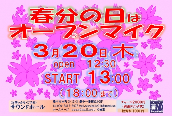 3月20日(木)春分の日はオープンマイクです🌸Open 12:30 Start 13:00 (18:00まで)チャージ2000円(ドリンク代別)皆様のご来店をお待ちしております ...
