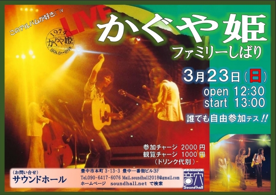 3月23日(日)13時~17時『かぐや姫ファミリー』を開催します♪かぐや姫メンバー関連のアーティストならOK!参加費:チャージ2000円(ドリンク別途)観覧のみ:チャージ1000円(ドリンク別途)皆様...