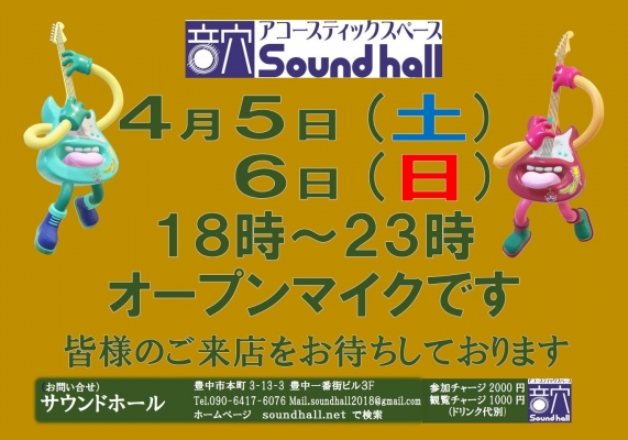 4月5・6日(土・日)は夜のみのオープマイク営業です♬ 営業時間18:00~23:00 チャージ2000yen(+order)皆様のご来店をお待ちしております m(..)m...