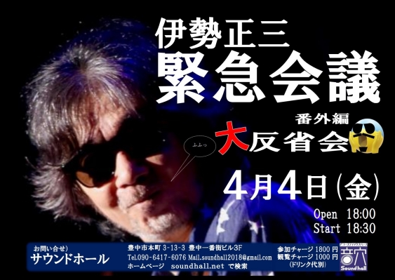 4月4日(金)『伊勢正三緊急会議』番外編反省会(^^)正やんの楽曲を披露して今後にブラッシュアップするオープンマイク形式の企画です(^^)おまけに今回はやっちまったなぁ(T.T)の方はカミングアウトし...